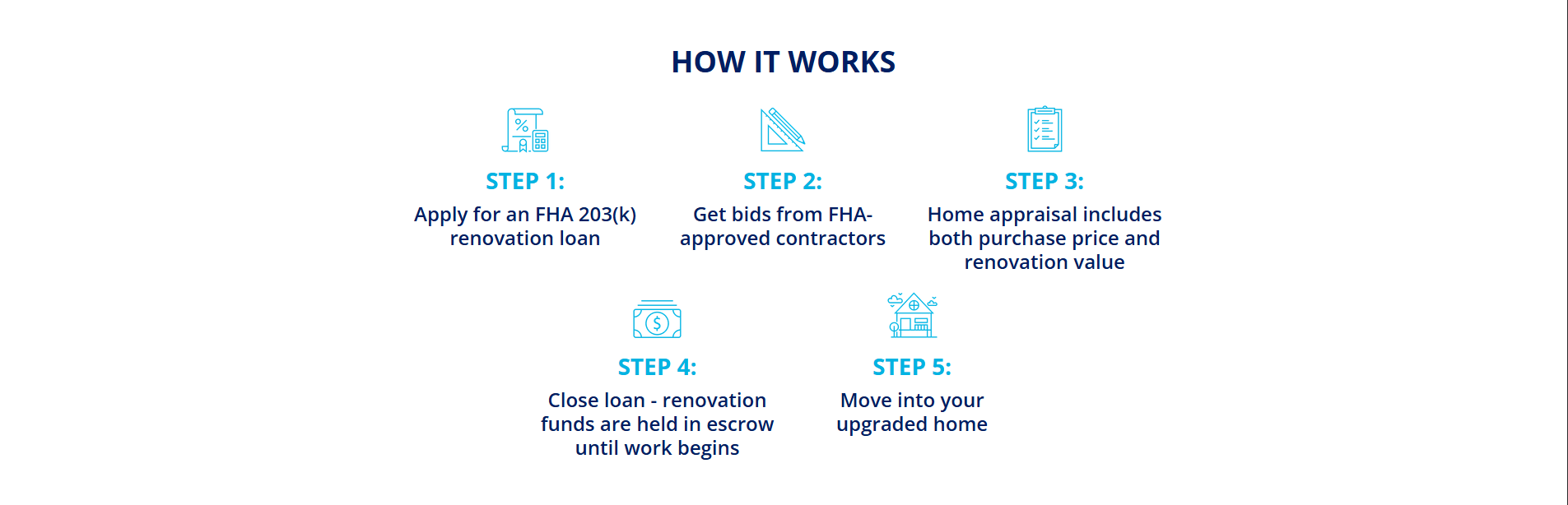 With an FHA 203(k) renovation loan, you can buy a fixer-upper or refinance your current home while including renovation costs—all in one mortgage.